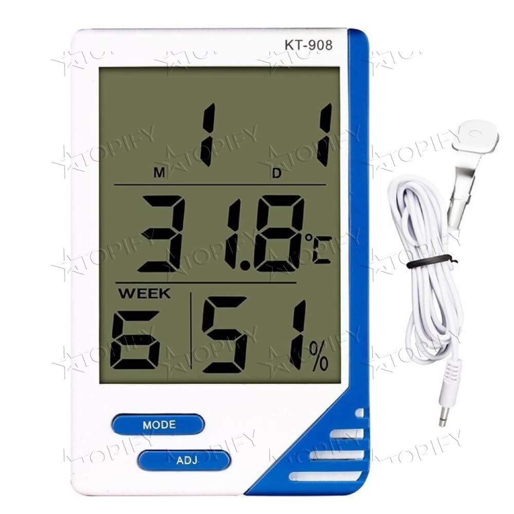 Термометр KT-908 представляет собой электронный прибор для измерения температуры, влажности, с часами, календарем и будильником. Вы можете разместить метеоприбор на стене в своей комнате, или в детской, чтобы всегда быть в курсе температурных и гигрометрических данных помещения. Термометр-гигрометр с часами оснащен так же датчиком температуры на 2-х метровом проводе, который может находиться снаружи помещения, и выводится, например, через окно. Это позволяет измерить и передать данные о температуре воздуха на улице. Температурные показатели на экране прибора могут отображаться в двух системах единиц: градусах Цельсия и по Фаренгейту.